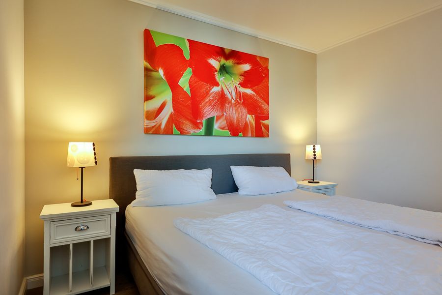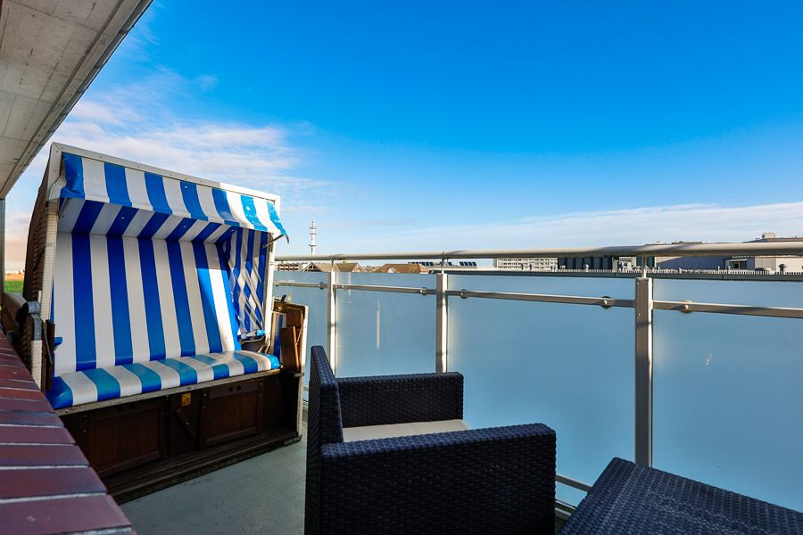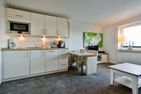Der offene Wohn- und Schlafbereich ist modern und praktisch gestaltet und verfügt über ein bequemes Sofa sowie einen eigenen Zugang zu einem möblierten Balkon. Hier können Sie die frische Nordseeluft genießen oder in einem eigenen Strandkorb entspannen. Die offene Küche fügt sich harmonisch in das Wohnkonzept ein und ist umfassend ausgestattet: Ihnen stehen ein Kühlschrank, eine Mikrowelle, eine Spülmaschine sowie ein 2-Platten-Herd zur Verfügung. Ergänzend stehen eine Nespresso-Espressomaschine, eine klassische Kaffeemaschine, ein Wasserkocher und ein Toaster bereit. Somit sind Sie bestens ausgestattet, um sich auch im Urlaub unkompliziert selbst zu versorgen.