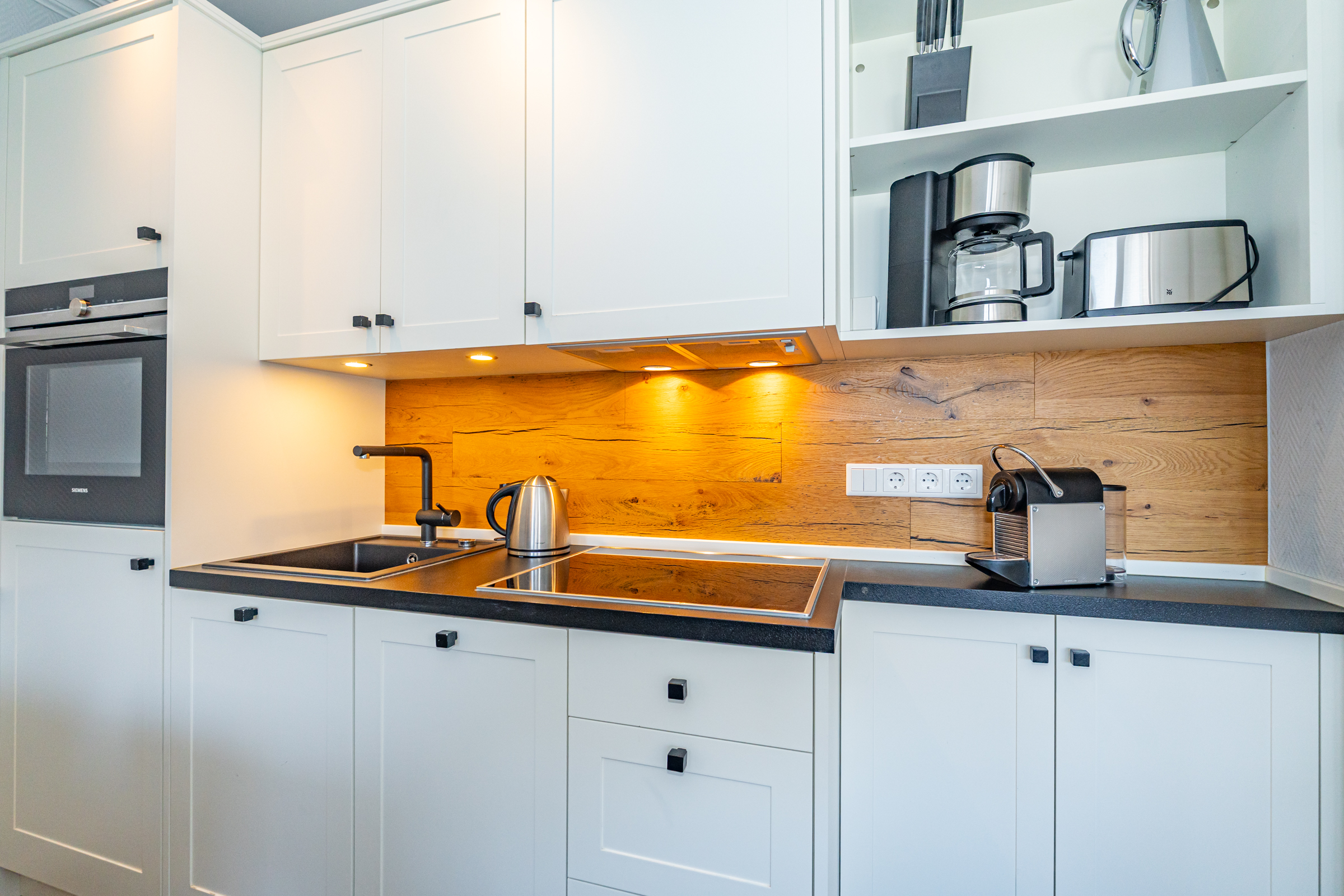 Die vollständig ausgestattete, offene Küche mit modernsten Geräten ist ein wahres Highlight des Schaumkrönchen. Hier finden Sie einen Herd, einen Backofen, einen Kühlschrank, eine Geschirrspülmaschine sowie eine Nespresso-Espressomaschine, die jeden Kaffeeliebhaber begeistern wird. Dank genügend Küchenutensilien und Geschirr bleiben keine Wünsche offen, egal ob Sie ein einfaches Frühstück oder ein mehrgängiges Menü zubereiten möchten.