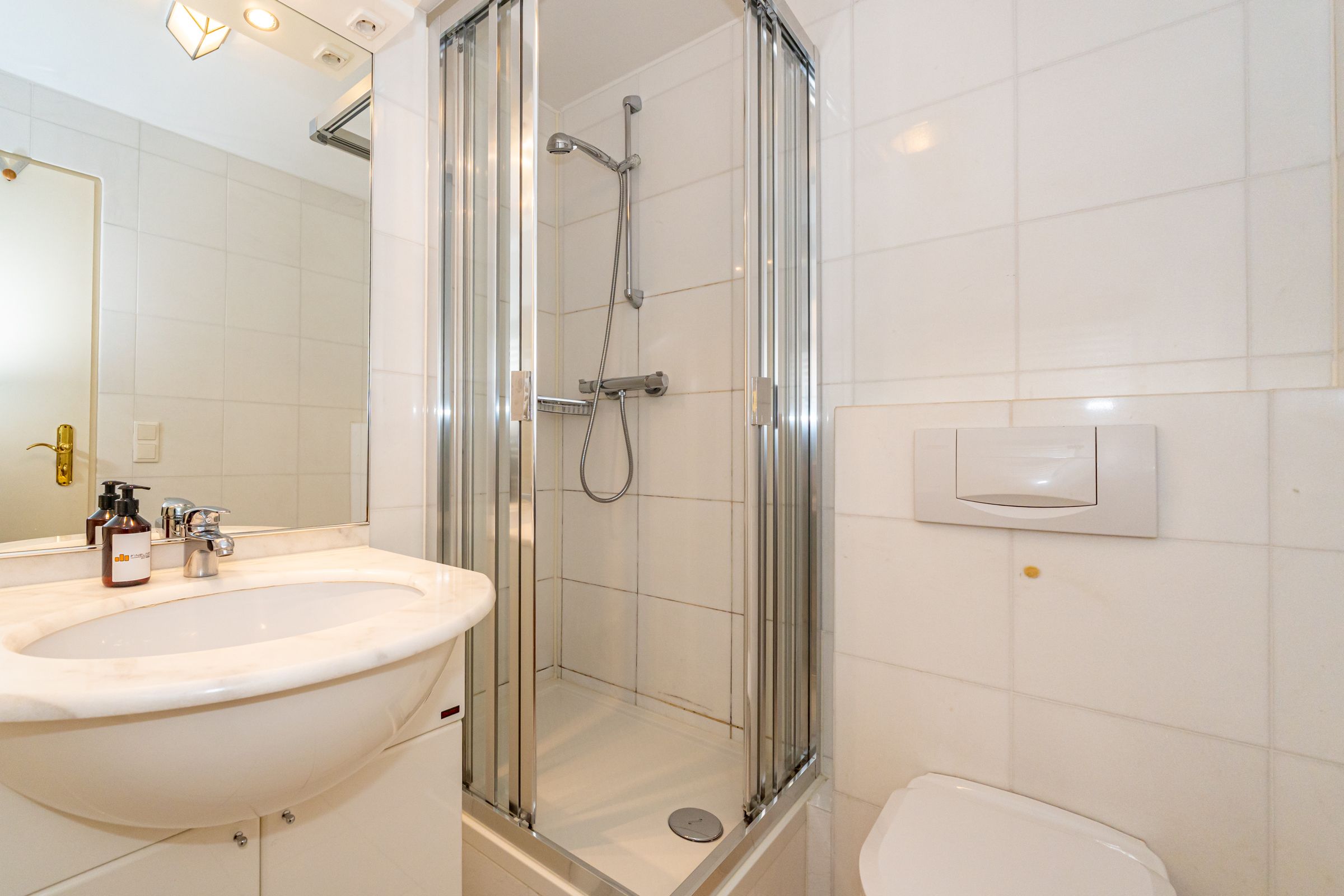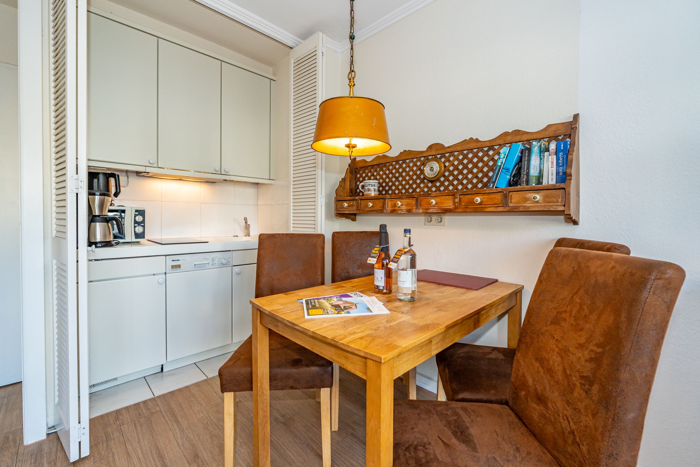 Im Erdgeschoss des Hochparterres befindet sich der Wohn- und Essbereich. Dieser verfügt über eine gemütliche Couch und einen Sessel, sowie ein TV und einen Essplatz. Angrenzend befindet sich die offene Küche in einer kleinen Koje, ausgestattet mit einem Kühlschrank, einem Geschirrspüler, einer Kaffeefiltermaschine, einem Toaster, und einem Ceranfeld. Vom Wohn- und Essbereich haben Sie Zugang zum Balkon mit Gartenmöbeln. Über eine Treppe gelangen Sie in das Souterrain, dort befindet sich das geräumige Schlafzimmer mit Doppelbett, Kleiderschrank und Couch.