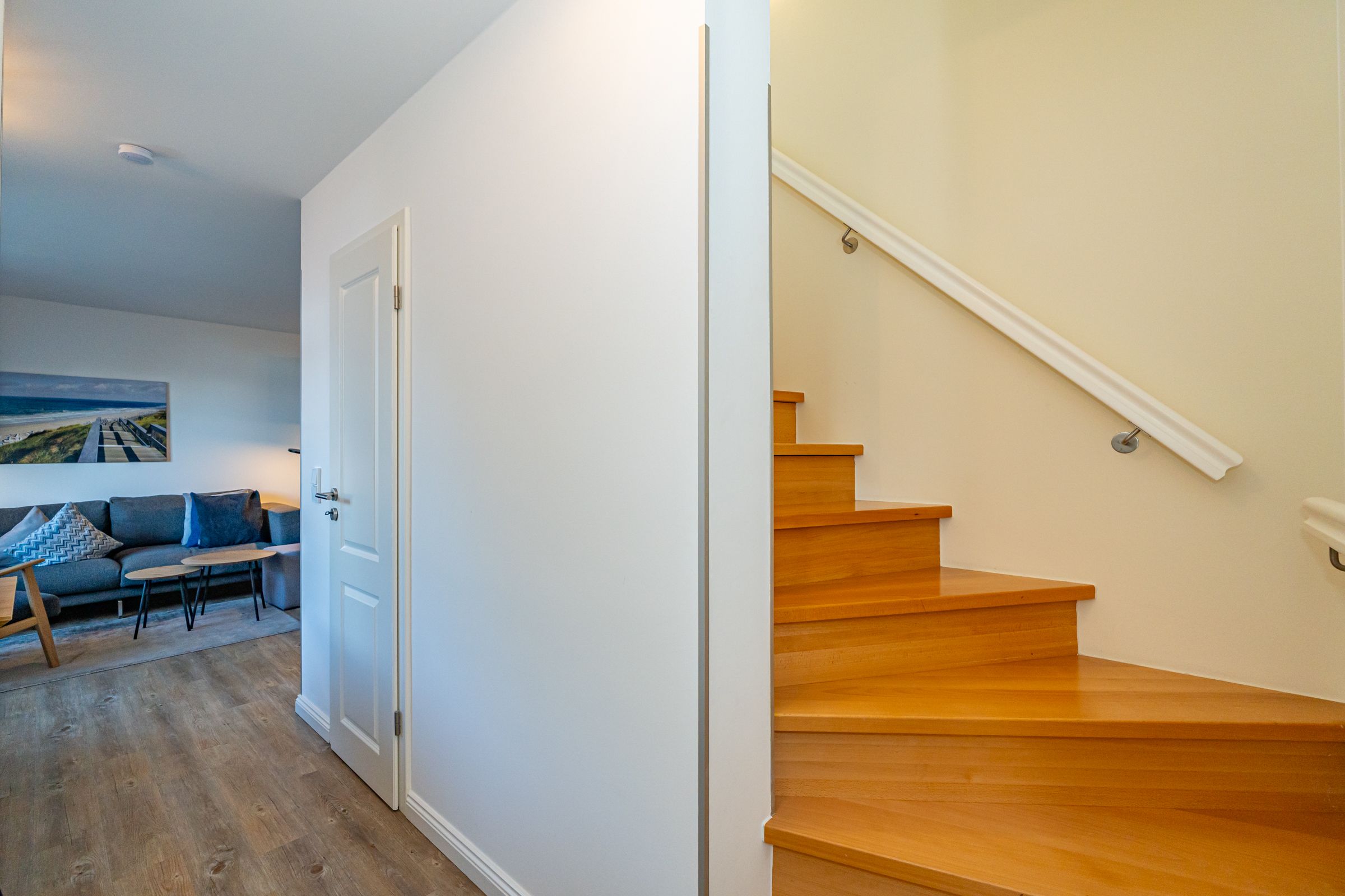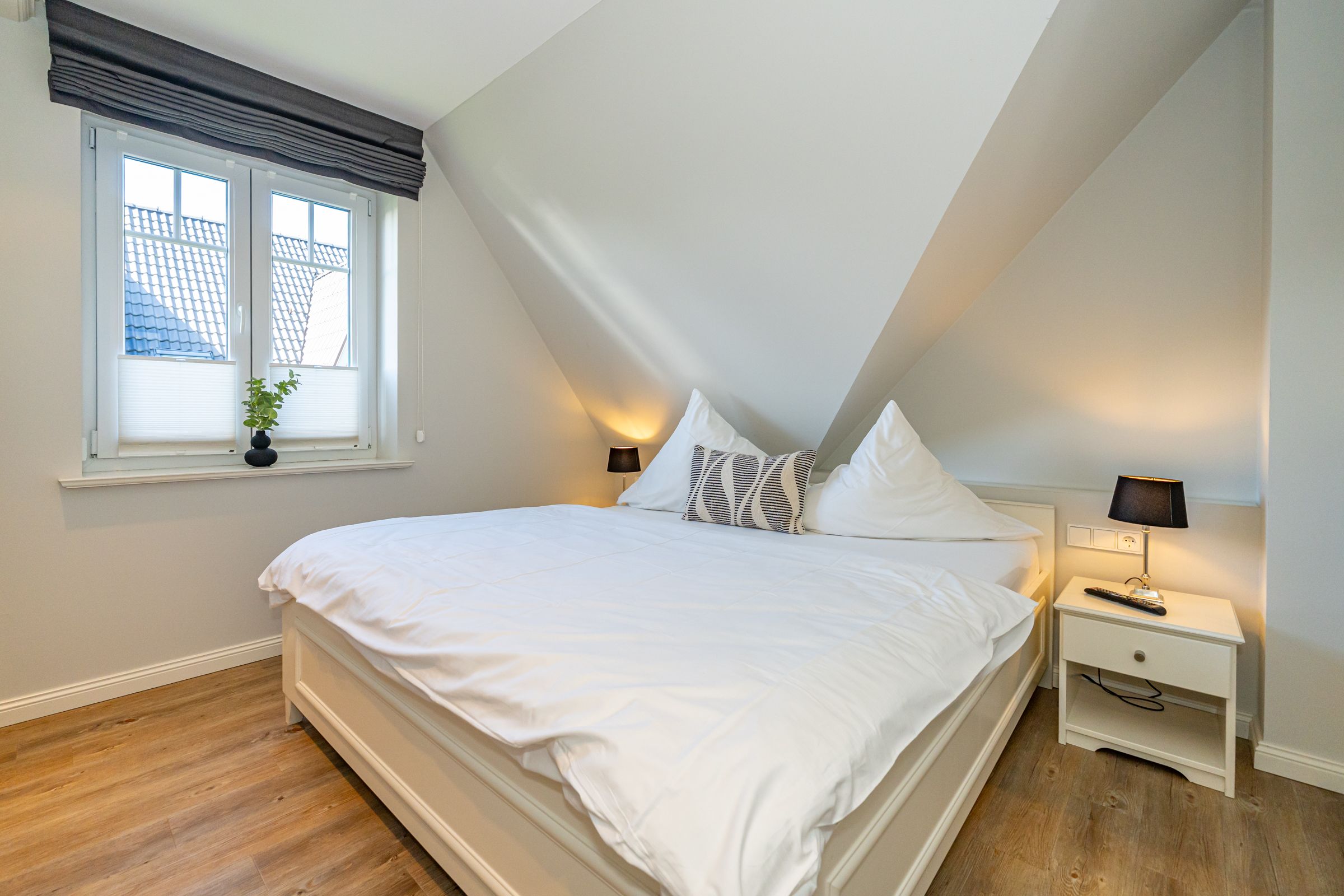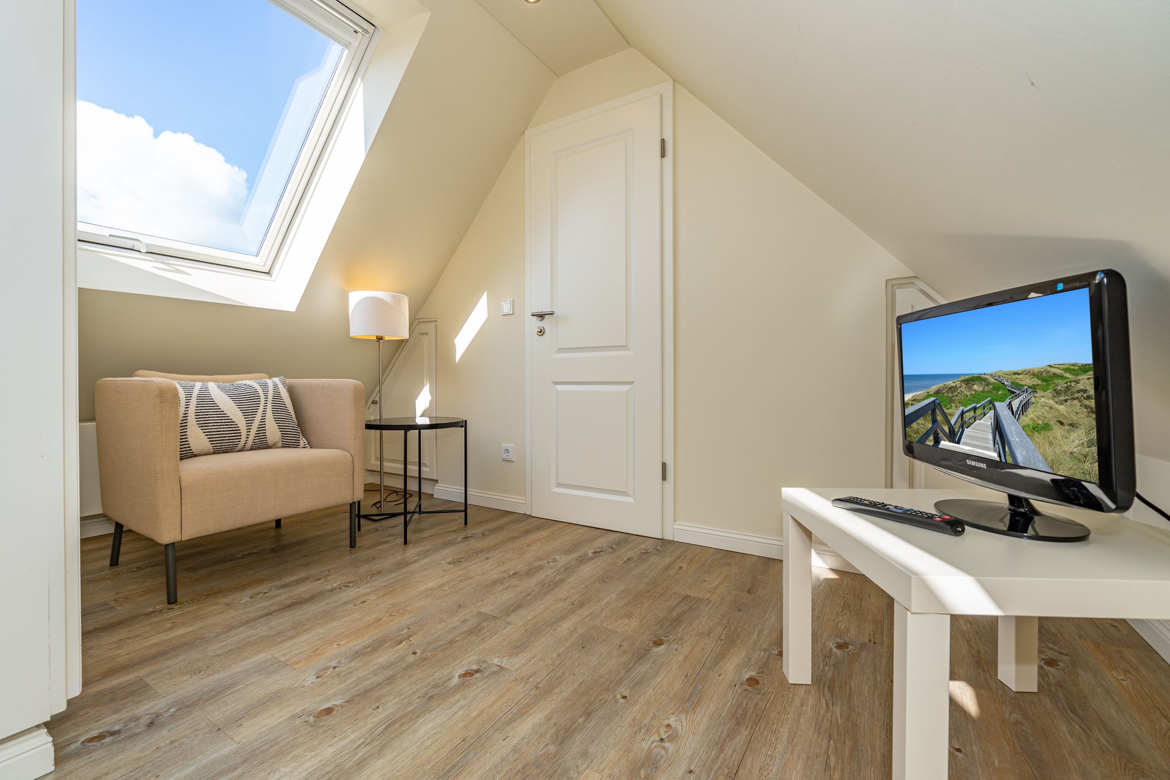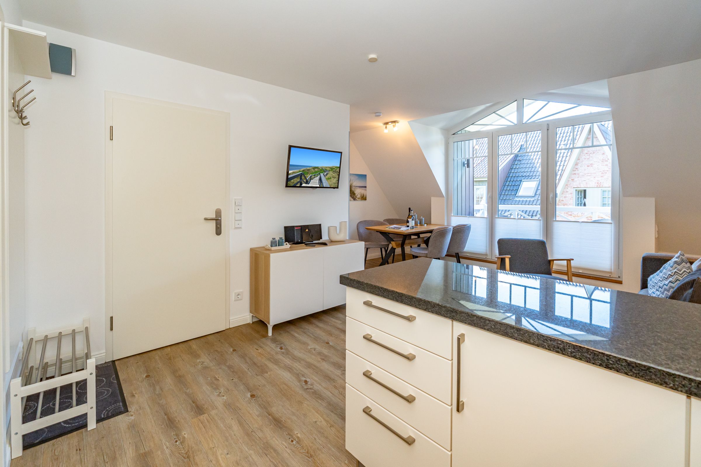Vollständige BeschreibungDiese 3-Zimmer-Ferienwohnung (ca. 77 qm) in einem kleinen Ferienhaus mit sechs Wohneinheiten liegt an der Ortsgrenze von Westerland zu Wenningstedt. Ein Bäcker, ein Lebensmittelgeschäft, ein Fahrradverleih und eine Bushaltestelle sind fußläufig sehr gut zu erreichen. Im 1 OG erwartet Sie ein moderner Wohn- / Essbereich mit TV von wo Sie Zugang zum Westbalkon haben, wo Sie auch noch am Nachmittag die Sonne genießen können. Ein Schlafzimmer mit gemütlichen Doppelbett (180 x 200 cm) und ein Badezimmer mit Wanne, Dusche, WC und Waschtrockner befinden sich ebenfalls auf dieser Ebene, genauso wie die moderne, offene Küche. Über eine Treppe gelangen Sie in das Dachgeschoss. Dort befindet sich das zweite Schlafzimmer mit Kojenbett (160 x 200 cm) und das angrenzende, kleine Badezimmer mit WC und Waschtisch. Beide Schlafzimmer verfügen über einen Fernseher. In der Ferienwohnung sind hochwertige, weiße Tischlereinbauten vorhanden für viel Stauraum. Ein Pkw-Stellplatz befindet sich am Haus. Tiere sind in dieser Ferienwohnung nicht erlaubt.