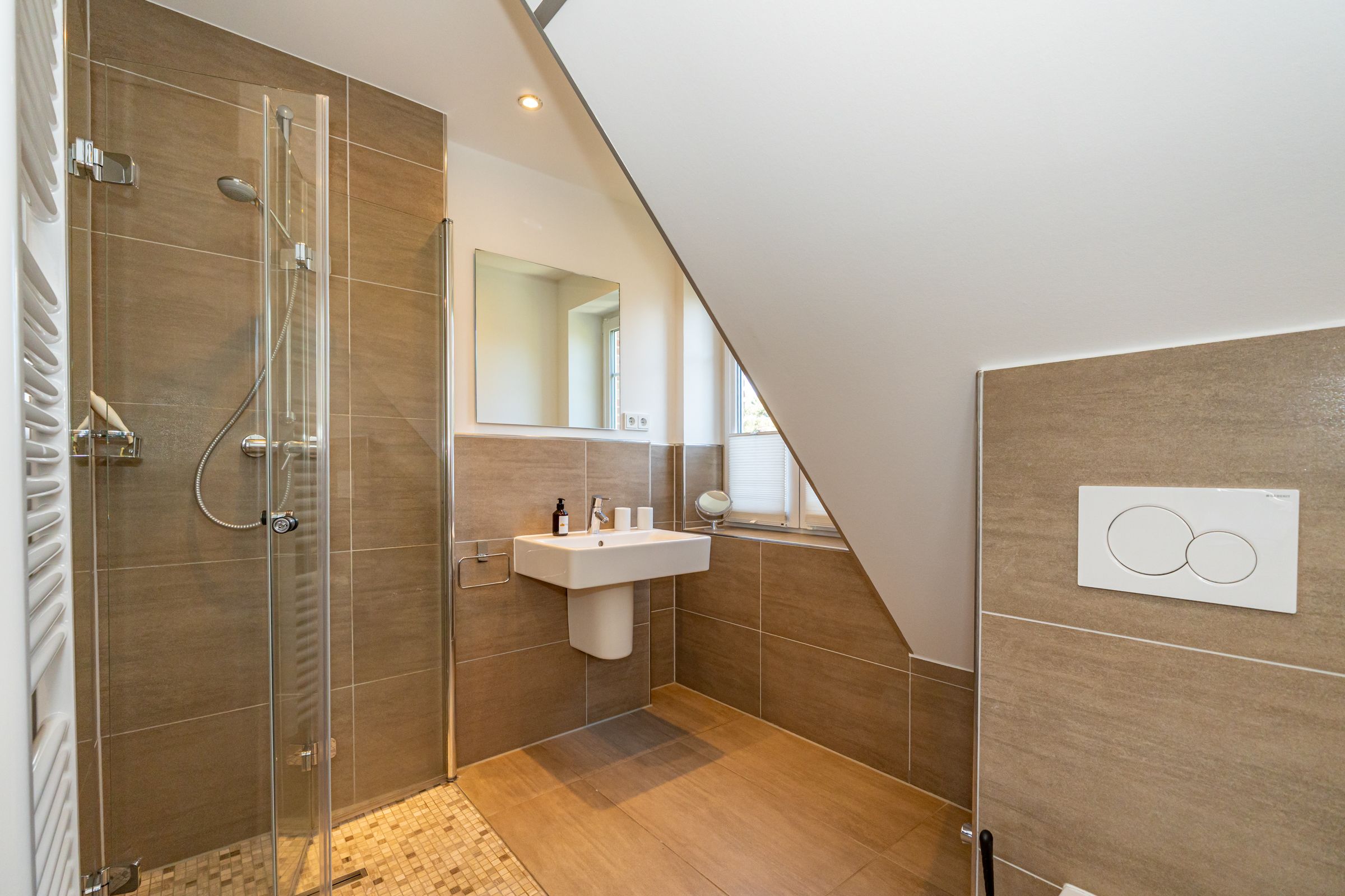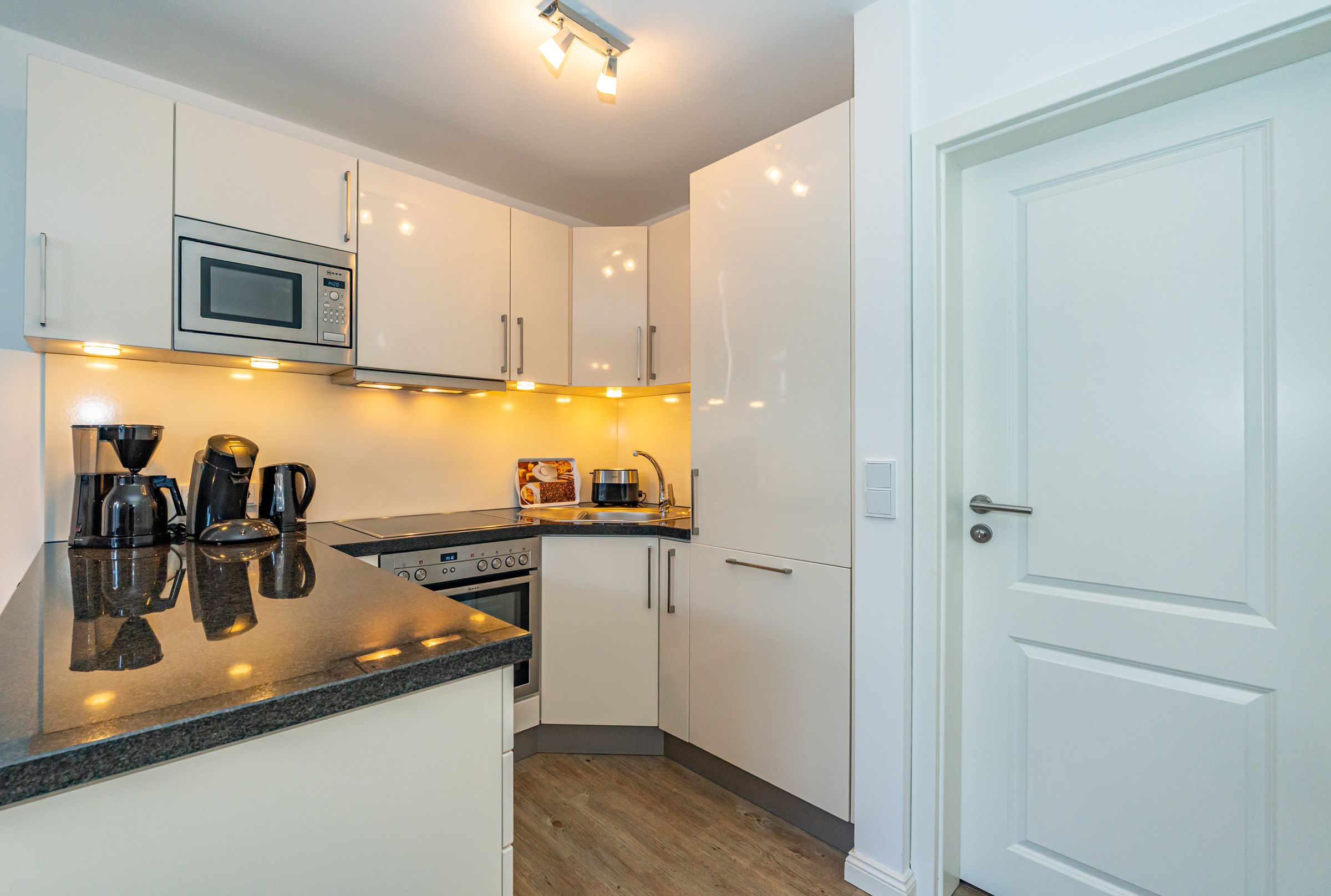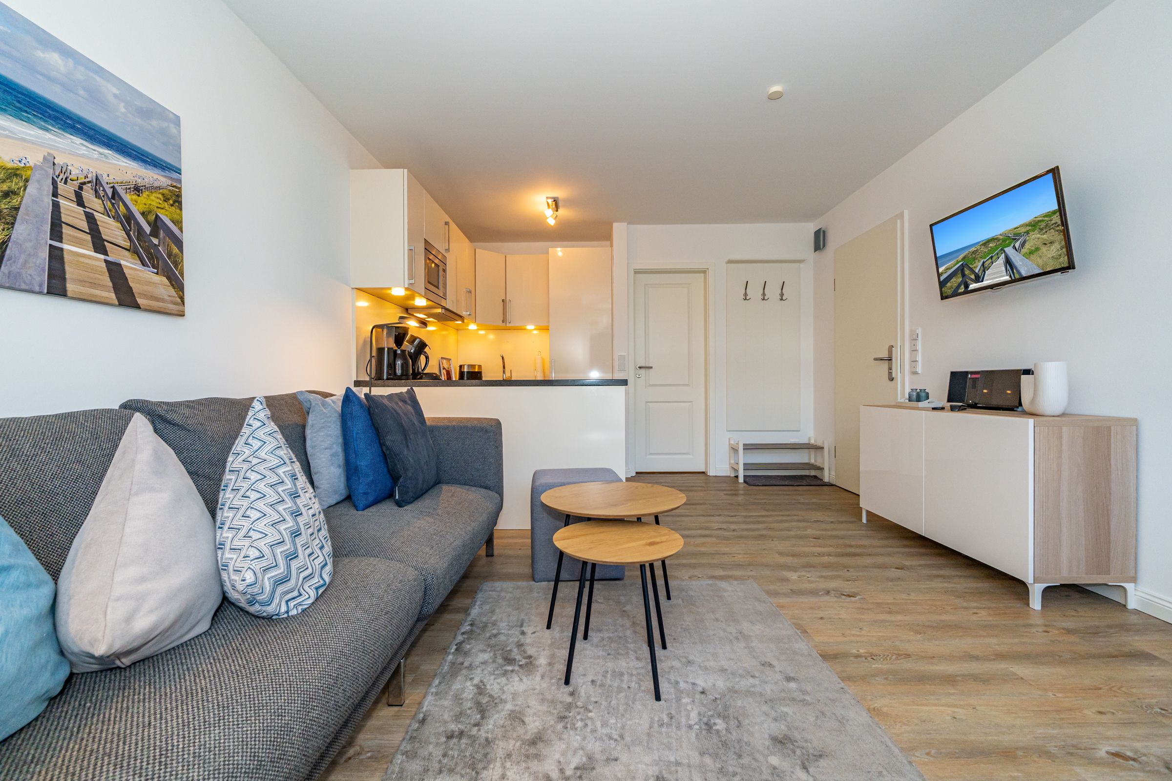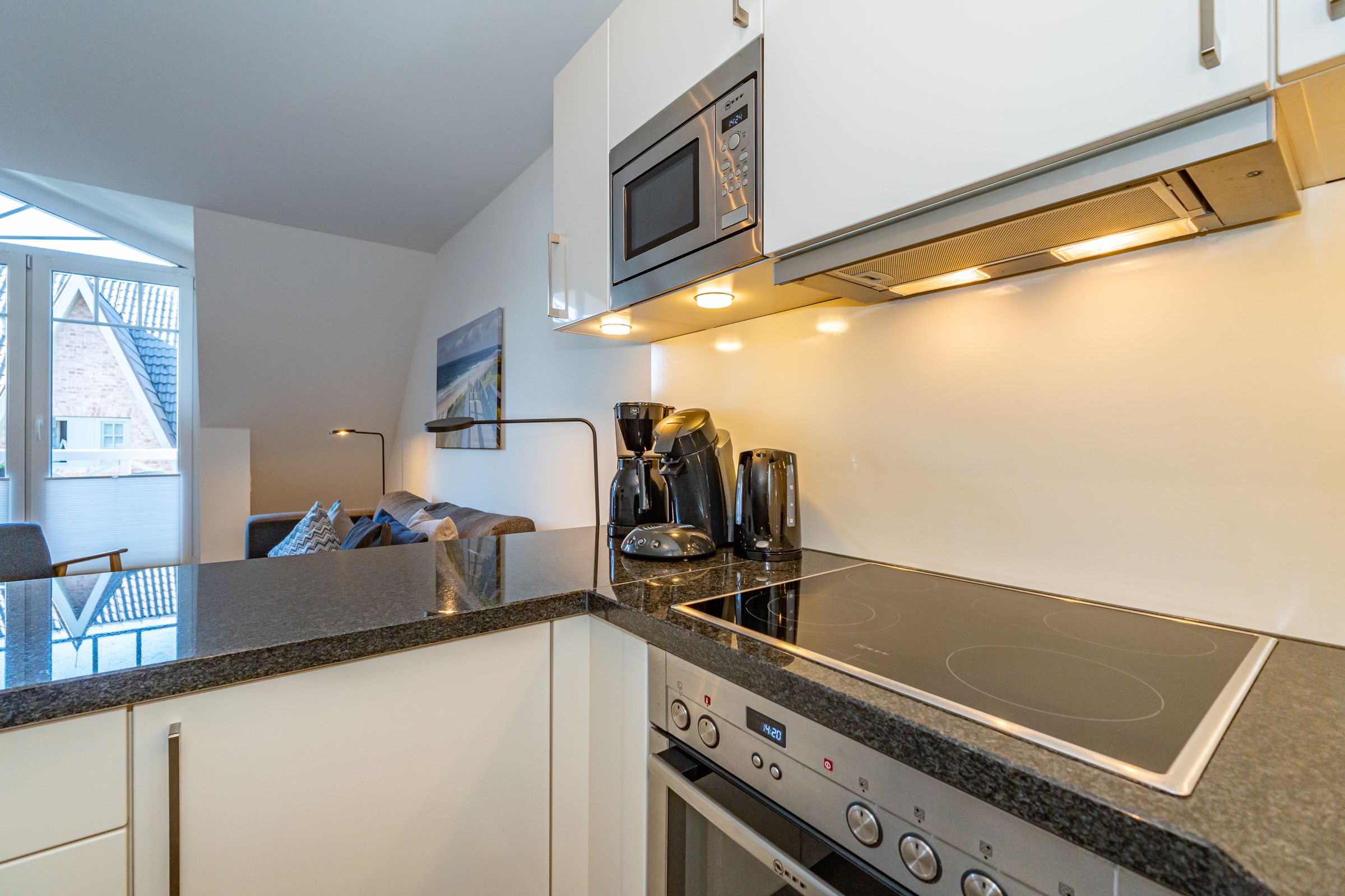 Vollständige BeschreibungDiese 3-Zimmer-Ferienwohnung (ca. 77 qm) in einem kleinen Ferienhaus mit sechs Wohneinheiten liegt an der Ortsgrenze von Westerland zu Wenningstedt. Ein Bäcker, ein Lebensmittelgeschäft, ein Fahrradverleih und eine Bushaltestelle sind fußläufig sehr gut zu erreichen. Im 1 OG erwartet Sie ein moderner Wohn- / Essbereich mit TV von wo Sie Zugang zum Westbalkon haben, wo Sie auch noch am Nachmittag die Sonne genießen können. Ein Schlafzimmer mit gemütlichen Doppelbett (180 x 200 cm) und ein Badezimmer mit Wanne, Dusche, WC und Waschtrockner befinden sich ebenfalls auf dieser Ebene, genauso wie die moderne, offene Küche. Über eine Treppe gelangen Sie in das Dachgeschoss. Dort befindet sich das zweite Schlafzimmer mit Kojenbett (160 x 200 cm) und das angrenzende, kleine Badezimmer mit WC und Waschtisch. Beide Schlafzimmer verfügen über einen Fernseher. In der Ferienwohnung sind hochwertige, weiße Tischlereinbauten vorhanden für viel Stauraum. Ein Pkw-Stellplatz befindet sich am Haus. Tiere sind in dieser Ferienwohnung nicht erlaubt.