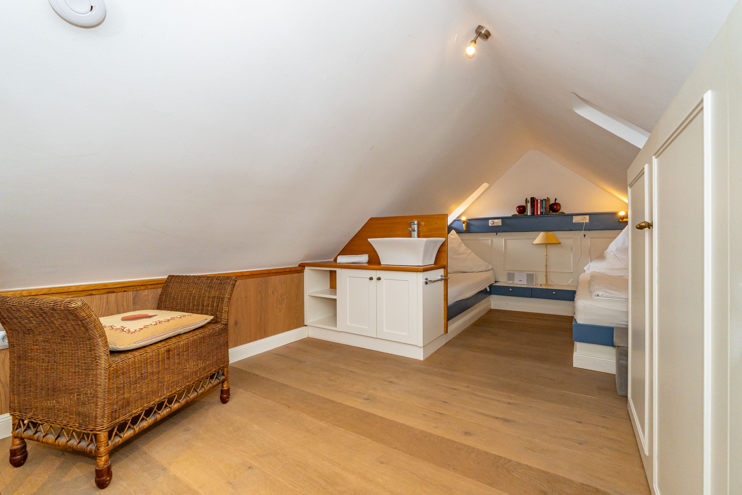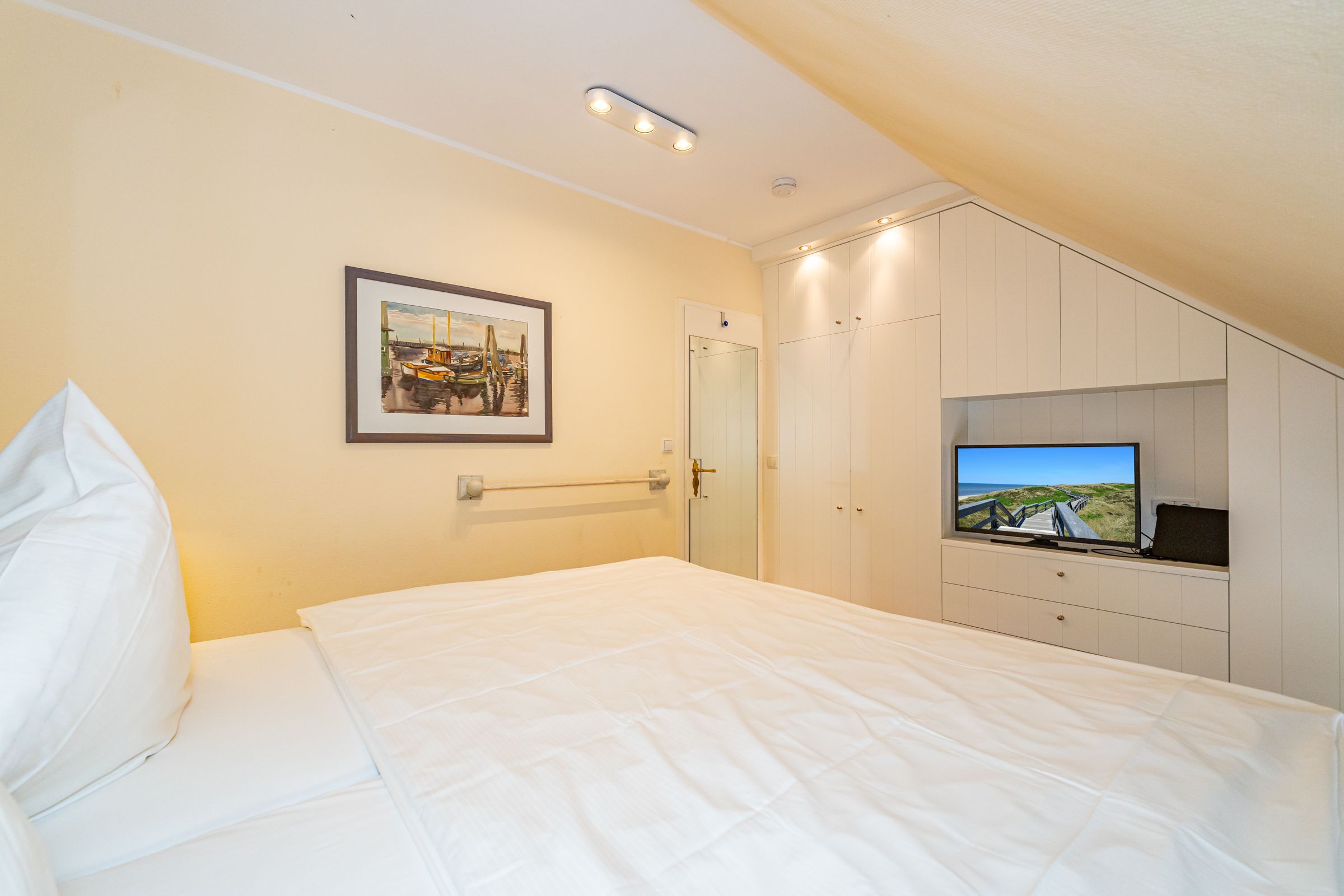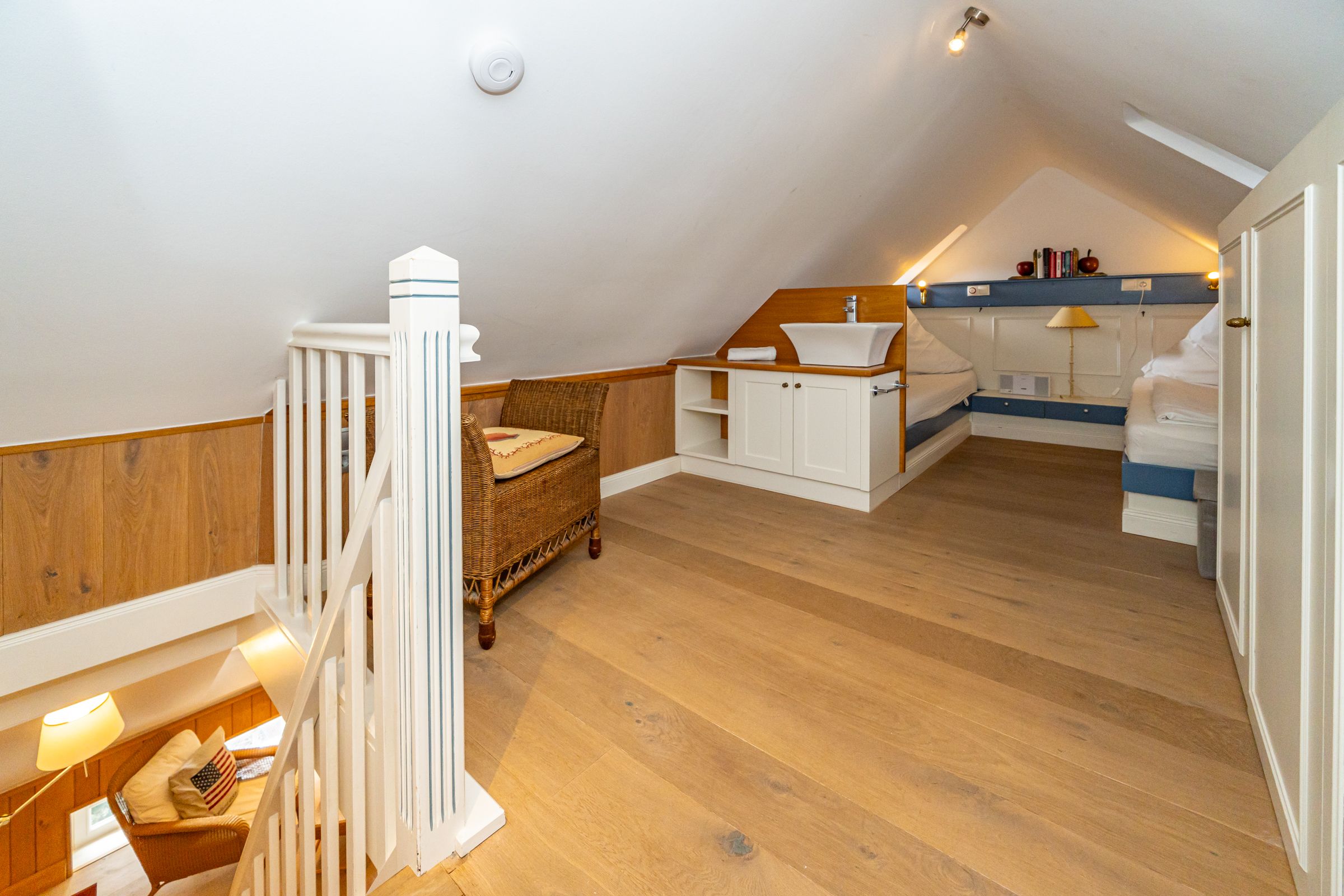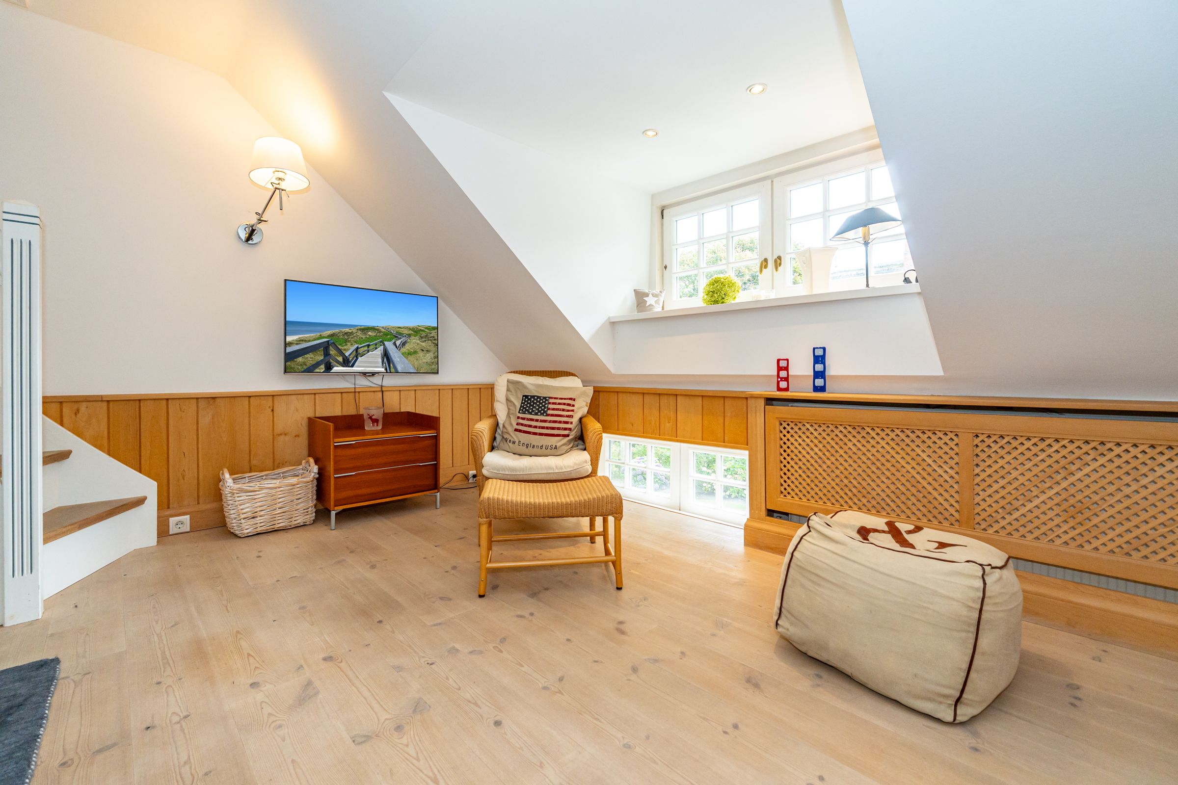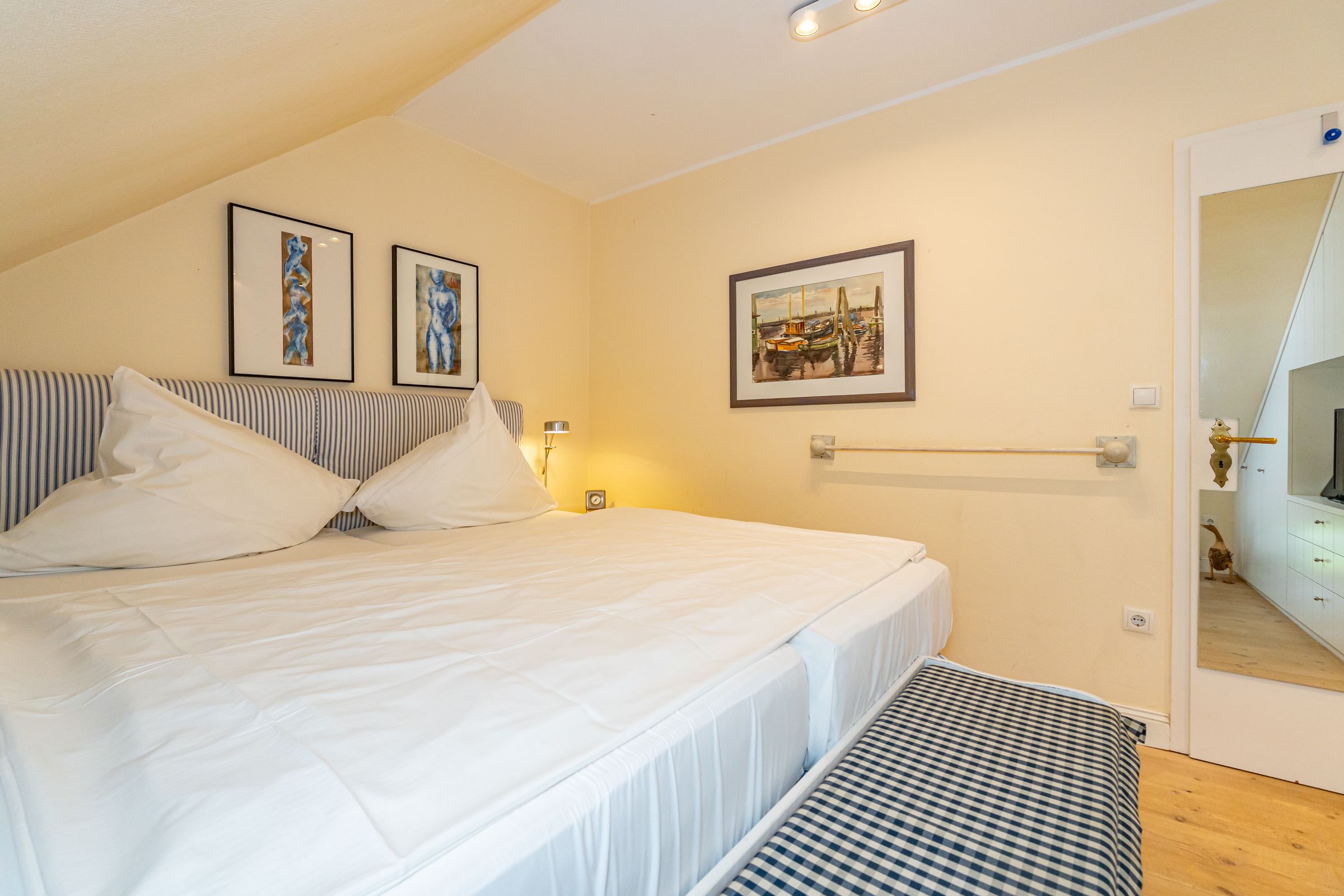 Der offen zum Wohnzimmer gestaltete Küchenbereich überzeugt mit moderner Ausstattung. Hier finden Sie unter anderem einen Ceranherd, eine Mikrowelle, eine Spülmaschine, einen Kühlschrank mit Gefrierfach, sowie eine Kaffeemaschine als auch eine Espressomaschine. Der angrenzende Wohnbereich bietet ein bequemes Sofa, einen Fernseher und einen Esstisch für 4 Personen. Das Badezimmer ist mit einer bodengleichen Dusche, einem WC, einem Waschbecken, einem Spiegel und einem Haartrockner ausgestattet und bietet somit Funktionalität und Komfort. Das erste Schlafzimmer liegt auf der selben Ebene wie der Wohn- und Essbereich und verfügt über ein Doppelbett und einen Fernseher. Hier spiegelt sich der friesische Charme mit gemütlichen Dachschrägen wieder. Das zweite Schlafzimmer erreichen Sie über eine Treppe und ist offen zum Wohn- und Essbereich gestaltet, ohne Zimmertür. Hier erwarten Sie zwei Einzelbetten.