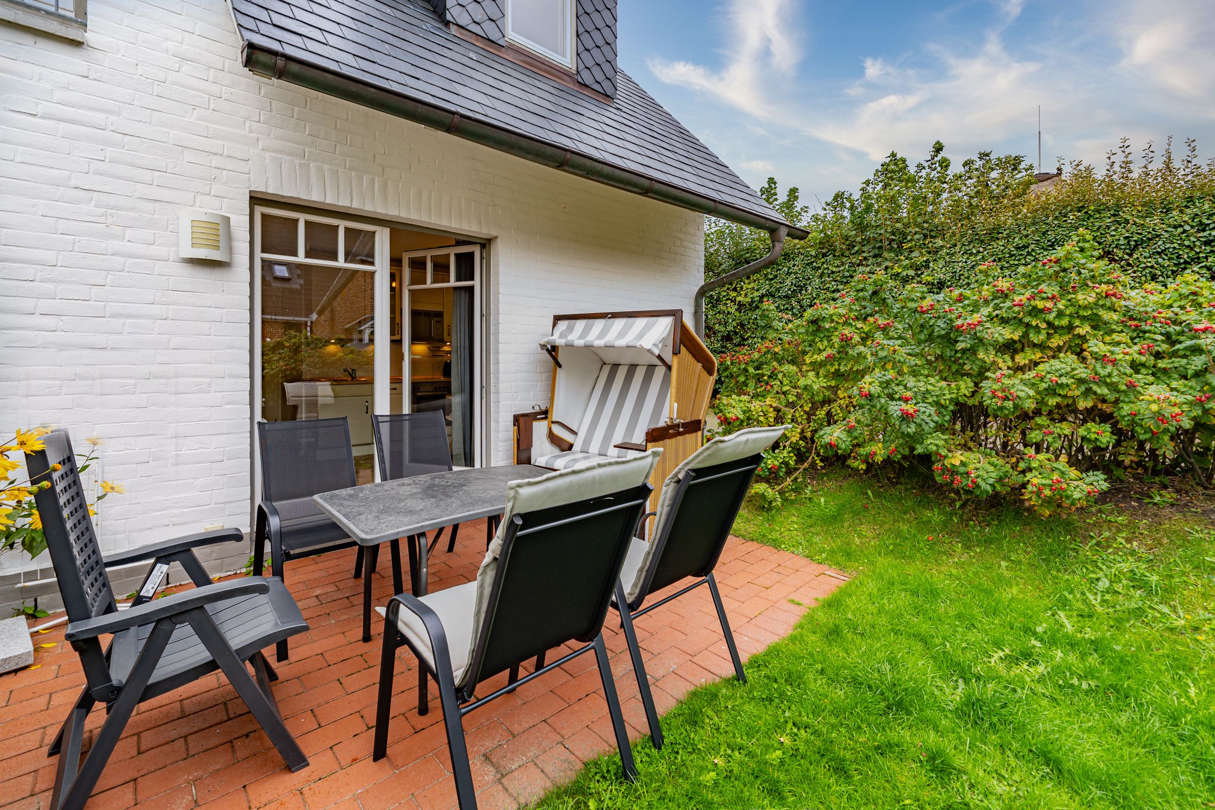 Der helle Wohnbereich ist einladend gestaltet und bietet neben TV und WLAN auch einen direkten Zugang zur eigenen Terrasse. Hier können Sie entspannte Stunden im Freien verbringen und den Tag bei frischer Nordseeluft ausklingen lassen. Die Terrasse eignet sich ideal zum Frühstücken im Freien oder zum gemütlichen Beisammensein am Abend.