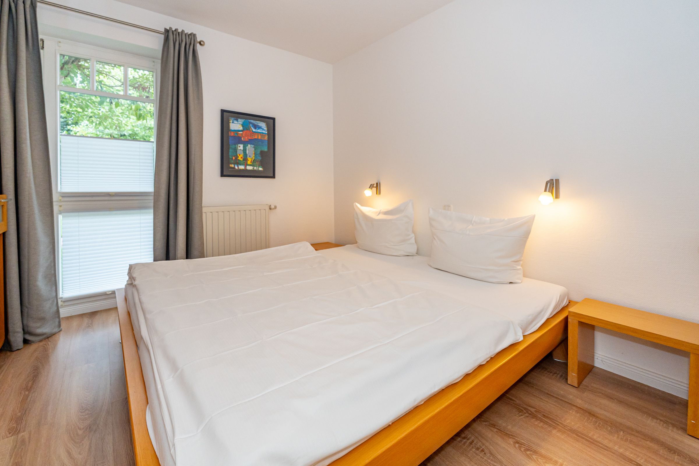 Zwei separate Schlafzimmer bieten komfortable Schlafmöglichkeiten für bis zu vier Personen. Beide Schlafzimmer sind mit lichtundurchlässigen Vorhängen ausgestattet, sodass Privatsphäre und angenehme Nachtruhe gewährleistet sind.