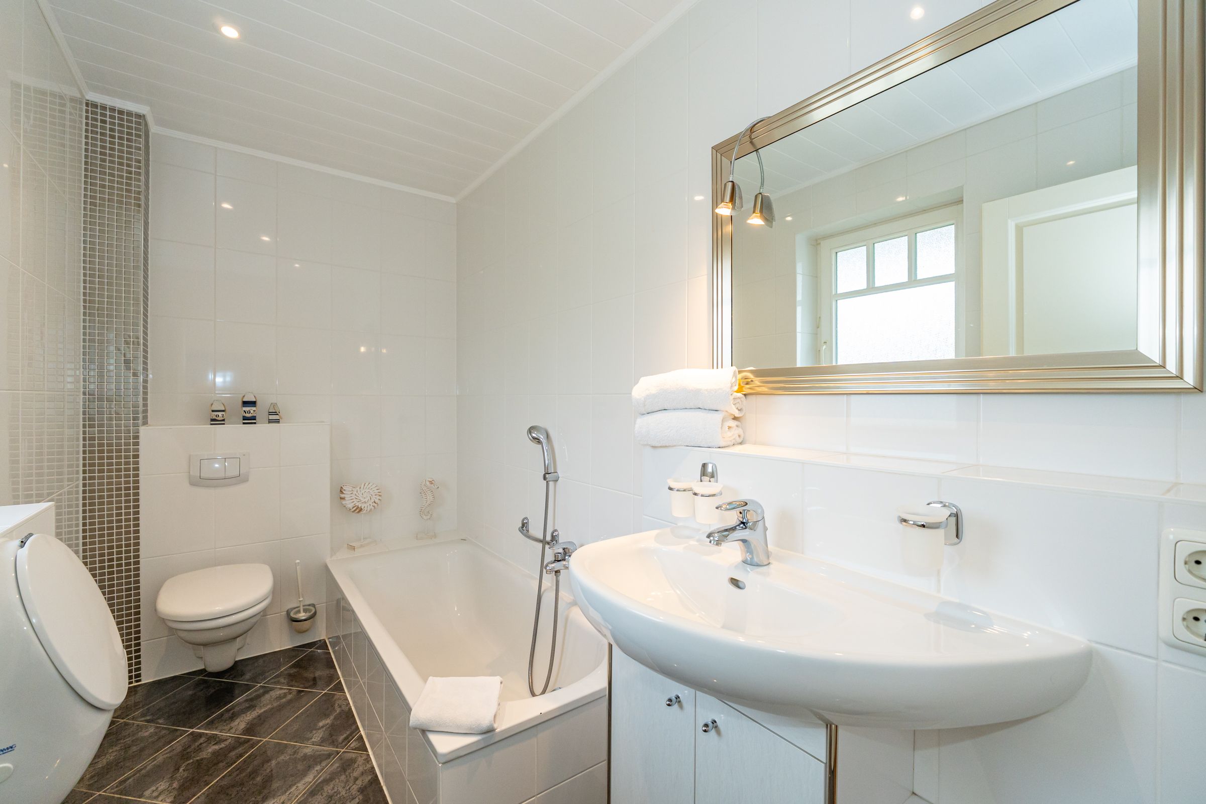 Die Ferienwohnung verfügt über zwei stilvoll ausgestattete Badezimmer. Eines der Bäder ist mit einer modernen Dusche und einer Badewanne ausgestattet, das andere bietet eine zusätzliche Dusche. Spiegel, Waschbecken und WC gehören selbstverständlich zur Ausstattung. Für entspannte Momente sorgt die zur Eigennutzung verfügbare private Sauna – genießen Sie Wellness und Erholung in Ihrer eigenen Ferienwohnung.