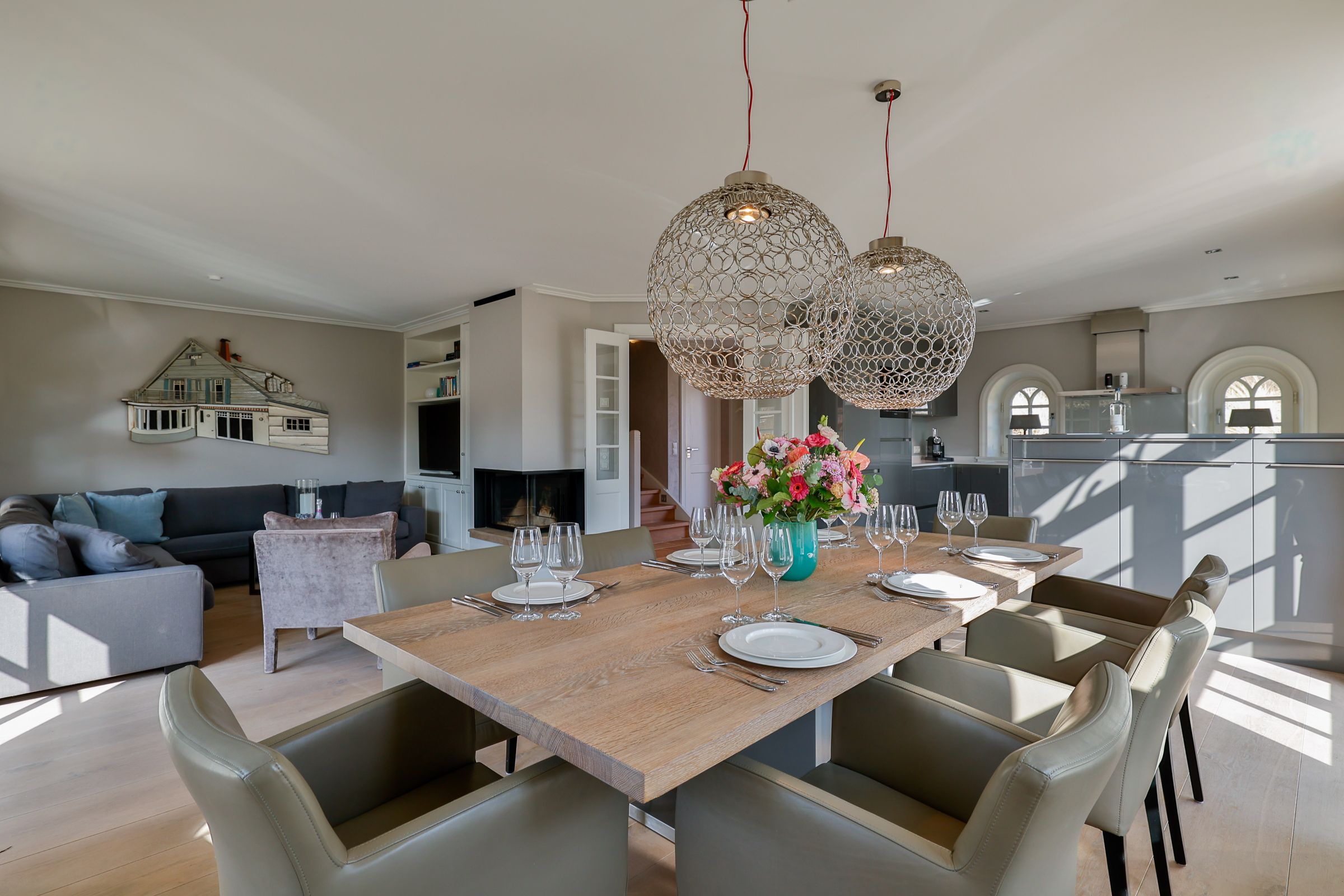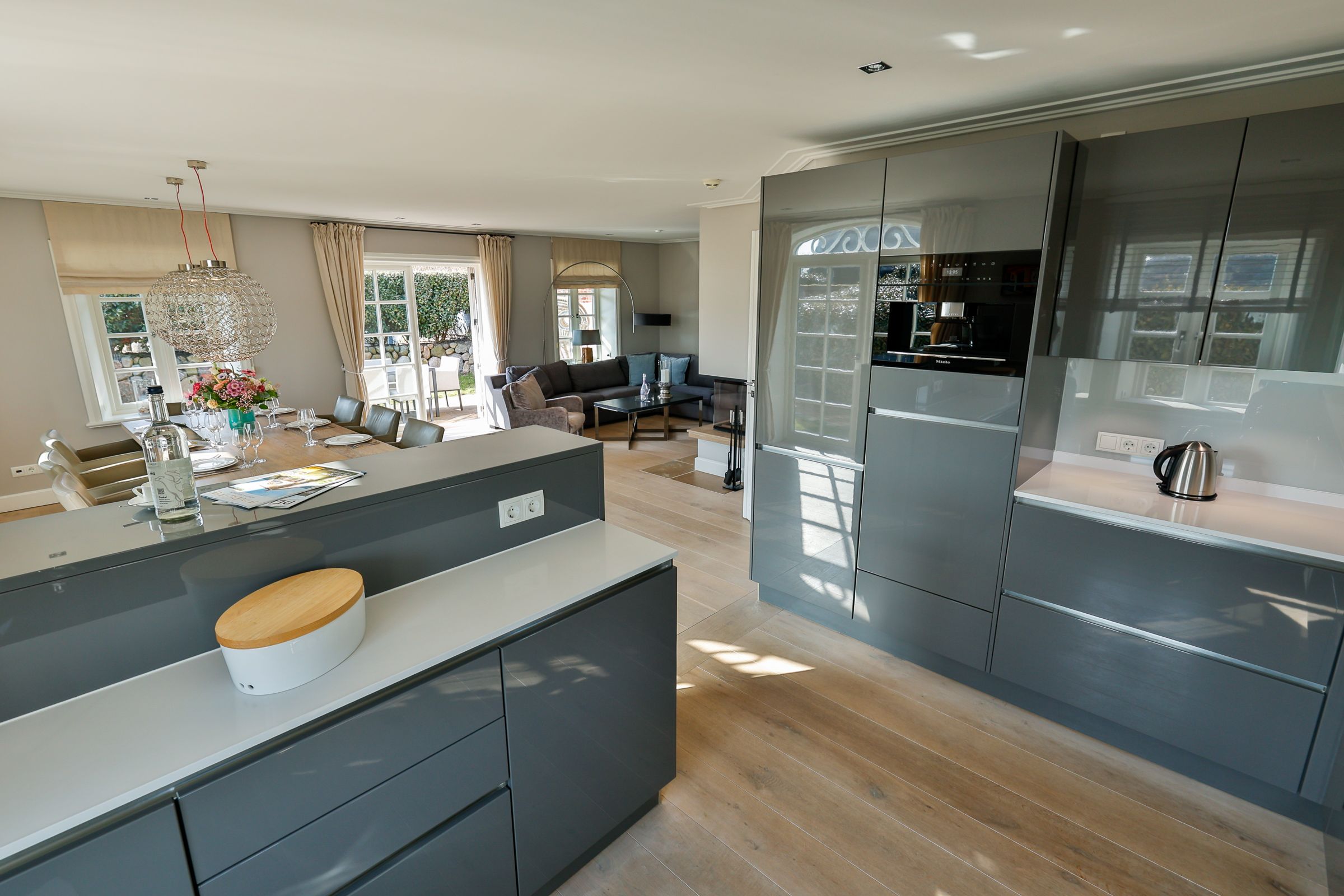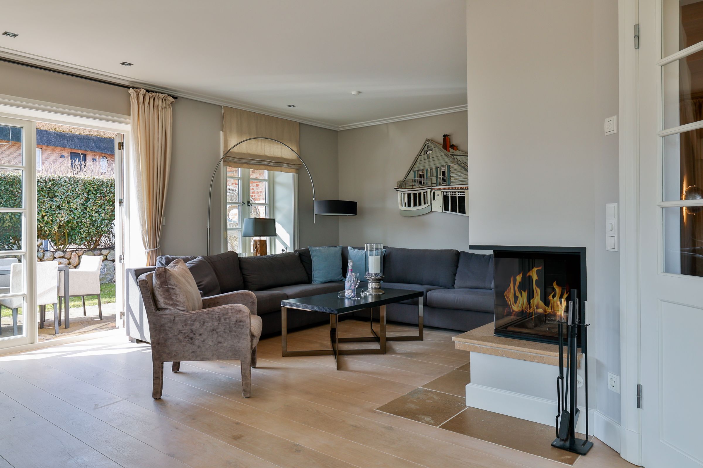 Im Erdgeschoss erwartet Sie ein einladender Wohnbereich, der durch die offene und freundliche Gestaltung zum gemeinsamen verweilen einlädt. Das gemütliche Wohnzimmer mit Essbereich bildet das Herzstück des Ferienhauses. Eine komfortable Couch und ein Fernseher sorgen für entspannte Stunden nach einem erlebnisreichen Urlaubstag. Besonders in den kühlen Jahreszeiten schafft der Kamin eine warme, behagliche Atmosphäre und lädt zu gemütlichen Abenden ein. Vom Wohnbereich aus gelangen Sie direkt auf die Terrasse, die mit Gartenmöbeln und einem Strandkorb (saisonal) ausgestattet ist. Direkt angrenzend befindet sich der großzügige Essbereich mit einem großen Esstisch, an dem alle Gäste bequem Platz finden. Die offene Küche zum Wohnbereich schafft eine angenehme Verbindung von Kochen und Beisammensein. Zur Ausstattung gehören Cerankochfeld, Backofen, Kühlschrank, zusätzlicher Gefrierschrank, Spülmaschine, Kaffeemaschine, Wasserkocher, Toaster sowie Küchenutensilien, Geschirr und Besteck. Damit sind die Voraussetzungen sowohl für das schnelle Frühstück als auch für gemeinsame Mahlzeiten in größerer Runde gegeben. Ebenfalls auf dieser Ebene befindet sich ein Gäste WC, welches Sie vom großzügigen Flur und Eingangsbereich aus erreichen.