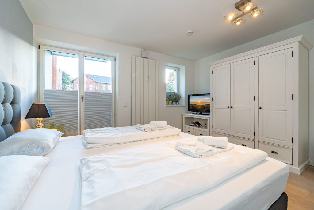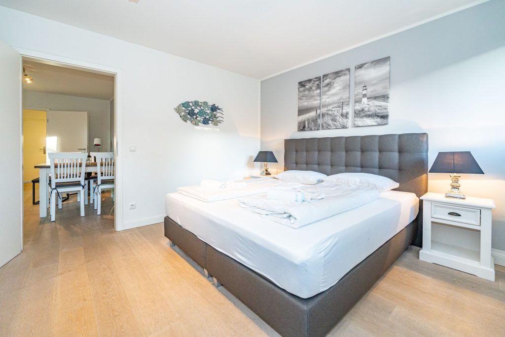 Vollständige BeschreibungDiese 3-Zimmer-Ferienwohnung (78 qm) befindet sich in einem Gebäude mit 22 Wohneinheiten. Die ebenerdige Ferienwohnung im Erdgeschoss besticht durch den großen, geräumigen Flur mit Einbaugarderobe und dem hellen, großzügigen Wohnzimmer mit Flachbildschirm und Esstisch. Die komplett ausgestattete und offene Küche (Mikrowelle, Kaffeefiltermaschine, Kühlschrank, Cerankochfeld, Backofen) ist direkt durch einen großen Durchgang vom Wohnzimmer aus zu erreichen. Von dort gelangen Sie in den Abstellraum, dort stehen Ihnen Waschmaschine und Trockner zur Verfügung. Das Badezimmer verfügt über einen Handtuchtrockner und eine bodentiefe Dusche. Abgerundet wird die Wohnung mit einer Terrasse (Süd-West-Ausrichtung), welche vom Wohnzimmer aus zu betreten ist und mit einem kleinen Gartenanteil umrundet wird. Ihnen stehen zwei Schlafzimmer mit jeweils Boxspringbett und TV zur Verfügung. Die Ferienwohnung liegt im Herzen von Westerland und ist somit auch sehr Stadt- und strandnah gelegen. In dieser Nichtraucherwohnung sind guterzogene Hunde nach vorheriger Anmeldung erlaubt (10,- € pro Tier/Tag). Ein Pkw-Stellplatz befindet sich in der Tiefgarage (Durchfahrtshöhe max. 2 Meter).
