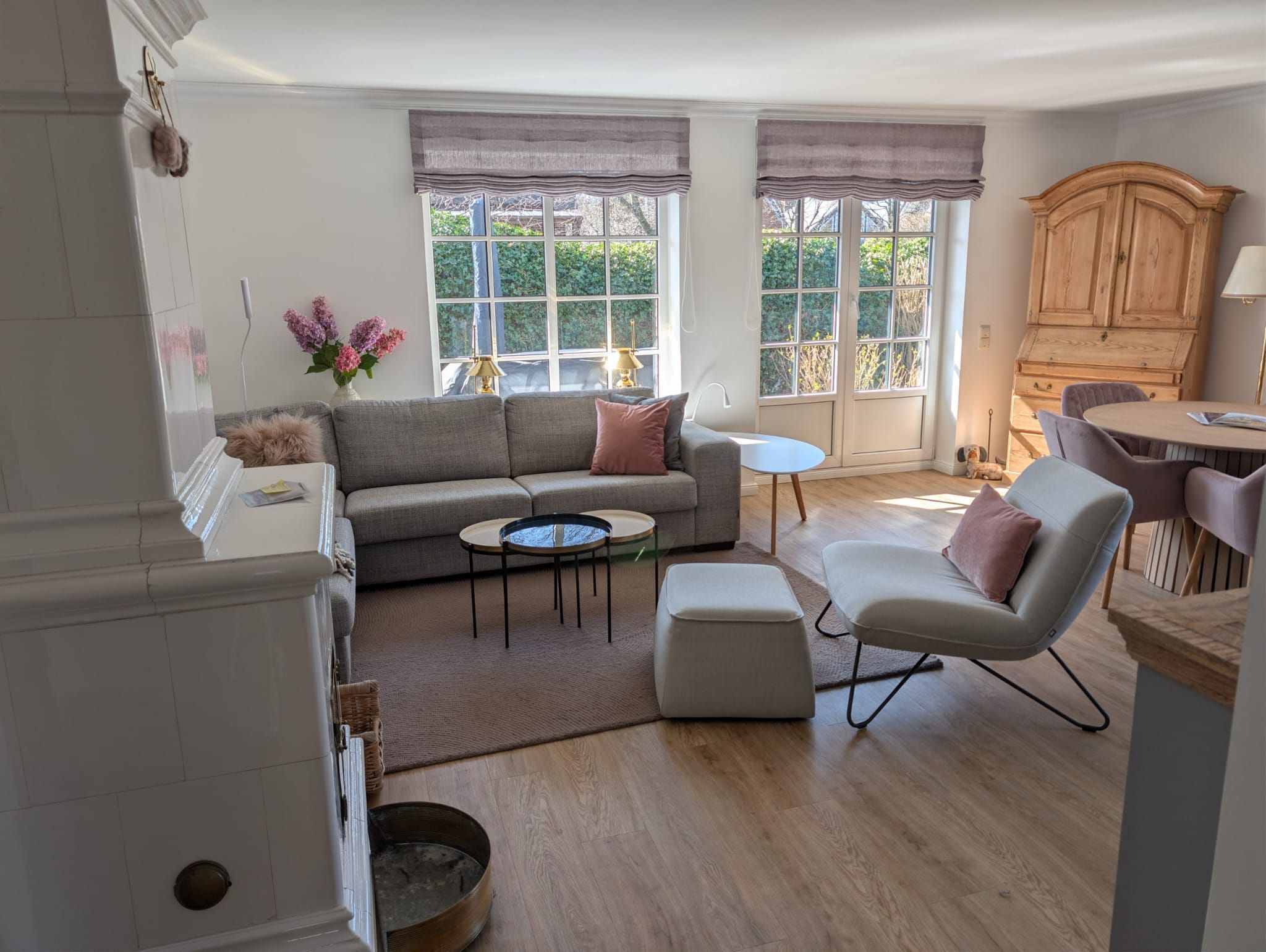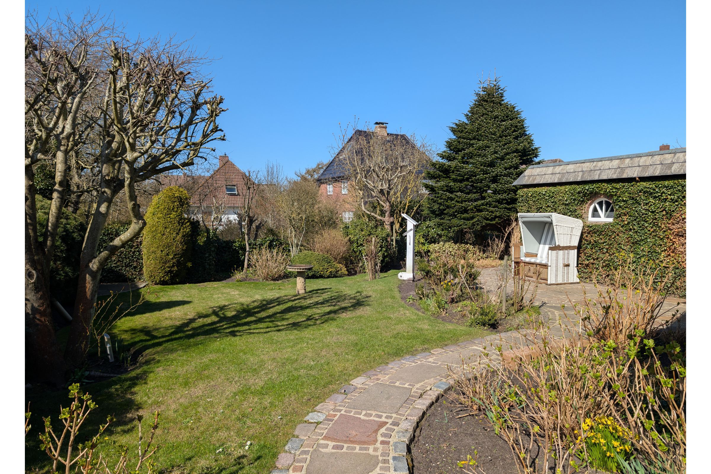 mit Sofa, Sessel, TV und Kaminofen zu entspannten Stunden ein. Von hier aus haben Sie Zutritt zum wunderschönen Garten. Im Außenbereich erwarten Sie zwei Terrassen, mit Gartenmöbeln sowie ein Strandkorb. Die offene Küche ist direkt mit dem Wohnzimmer verbunden und praktisch für gemeinsame Mahlzeiten und geselliges Beisammensein konzipiert. Sie ist mit Cerankochfeld, Backofen, Kühlschrank mit Gefrierfach, Spülmaschine, Kaffeemaschine, Nespresso-Espressomaschine, Wasserkocher, sowie Toaster ausgestattet. Ein Esstisch schafft beste Voraussetzungen für entspannte Frühstücke oder lange Abende in der Unterkunft. Über eine Treppe gelangen Sie in das erste Obergeschoss. Dort erwartet Sie ein Schlafzimmer mit Doppelbett und Kleiderschrank. Ebenfalls auf dieser Ebene befindet sich ein Badezimmer mit Dusche, Waschbecken und WC. Über die Treppe gelangen Sie auch in das Untergeschoss (Souterrain) des Hauses. Dort befindet sich das zweite Schlafzimmer mit Doppelbett, hier steht Ihnen ein TV zur Verfügung. Ebenfalls im Untergeschoss befindet sich das zweite Badezimmer, ausgestattet mit einer Duschwanne, WC und Waschbecken. Zusätzlich gibt es noch ein Gäste WC auf dieser Ebene. Für den Alltag im Urlaub stehen Ihnen zudem Waschmaschine und Trockner zur Eigennutzung zur Verfügung. Ein Privatparkplatz ist direkt an der Unterkunft vorhanden. Sie können Ihre E-Bikes in der Garage unterstellen.