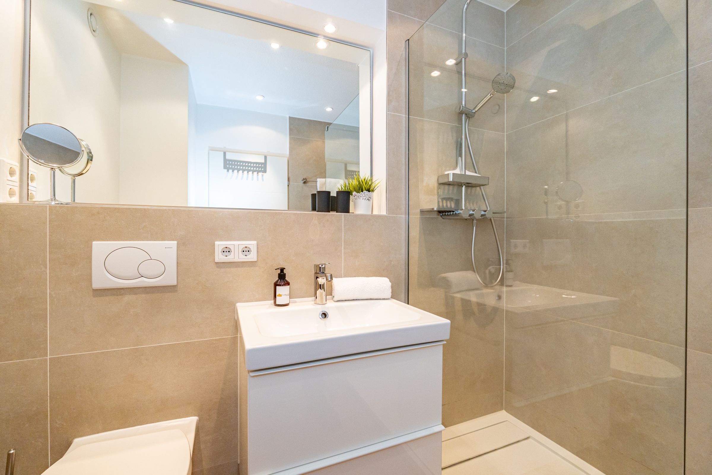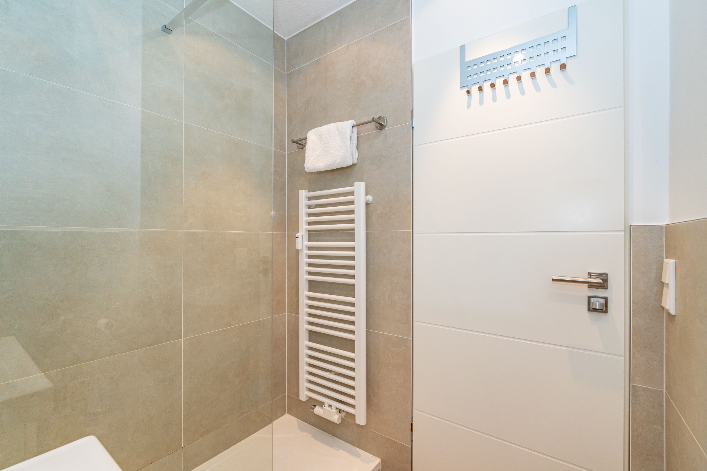 Im Wohnbereich erwartet Sie eine gemütliche Sofaecke mit Essbereich, ergänzt durch einen Esstisch. Für Unterhaltung sorgen ein Fernseher, Radio und kostenfreies WLAN. Der Kamin dient lediglich der Dekoration und spendet keine Wärme. Im separaten Schlafzimmer finden Sie ein komfortables Doppelbett ( 180x200m) und einen weiteren Fernseher. Das Badezimmer ist modern mit einer bodengleichen Dusche, Waschbecken, WC, Spiegel, Kosmetikspiegel, Haartrockner ausgestattet. Besonders hervorzuheben ist der Balkon, der mit Gartenmöbeln ausgestattet ist und zum Verweilen im Freien einlädt.