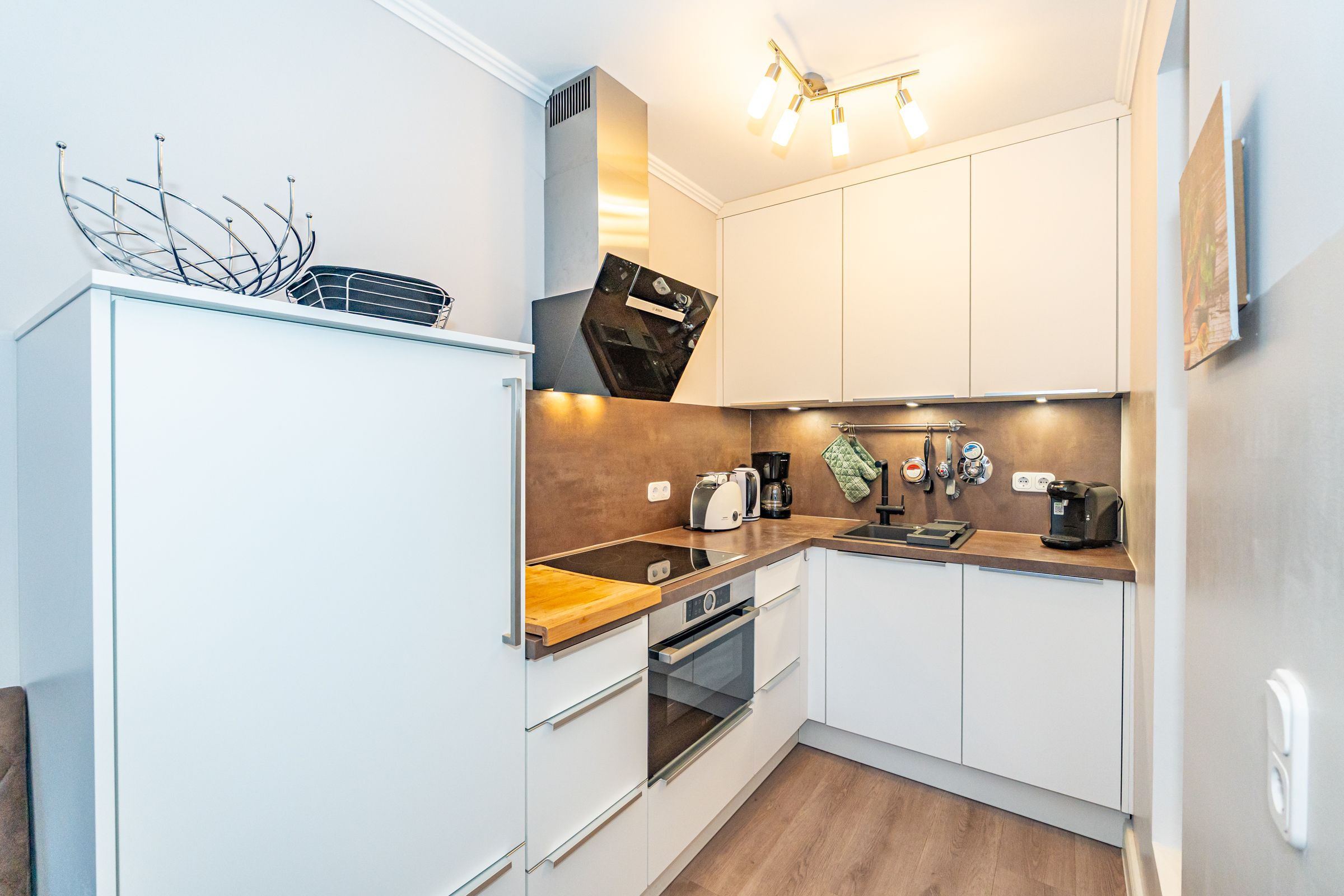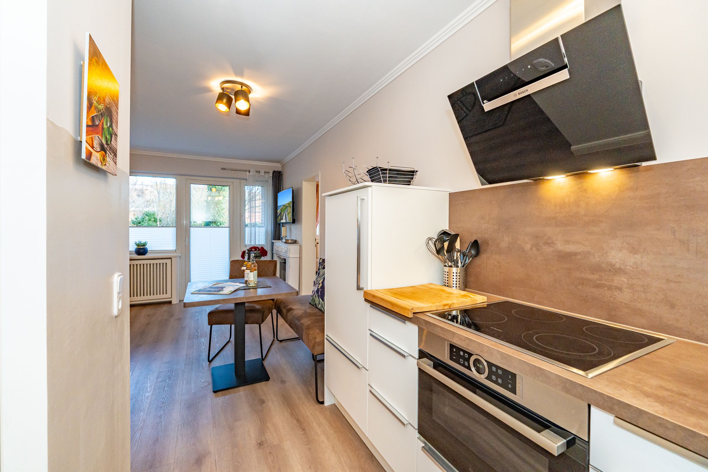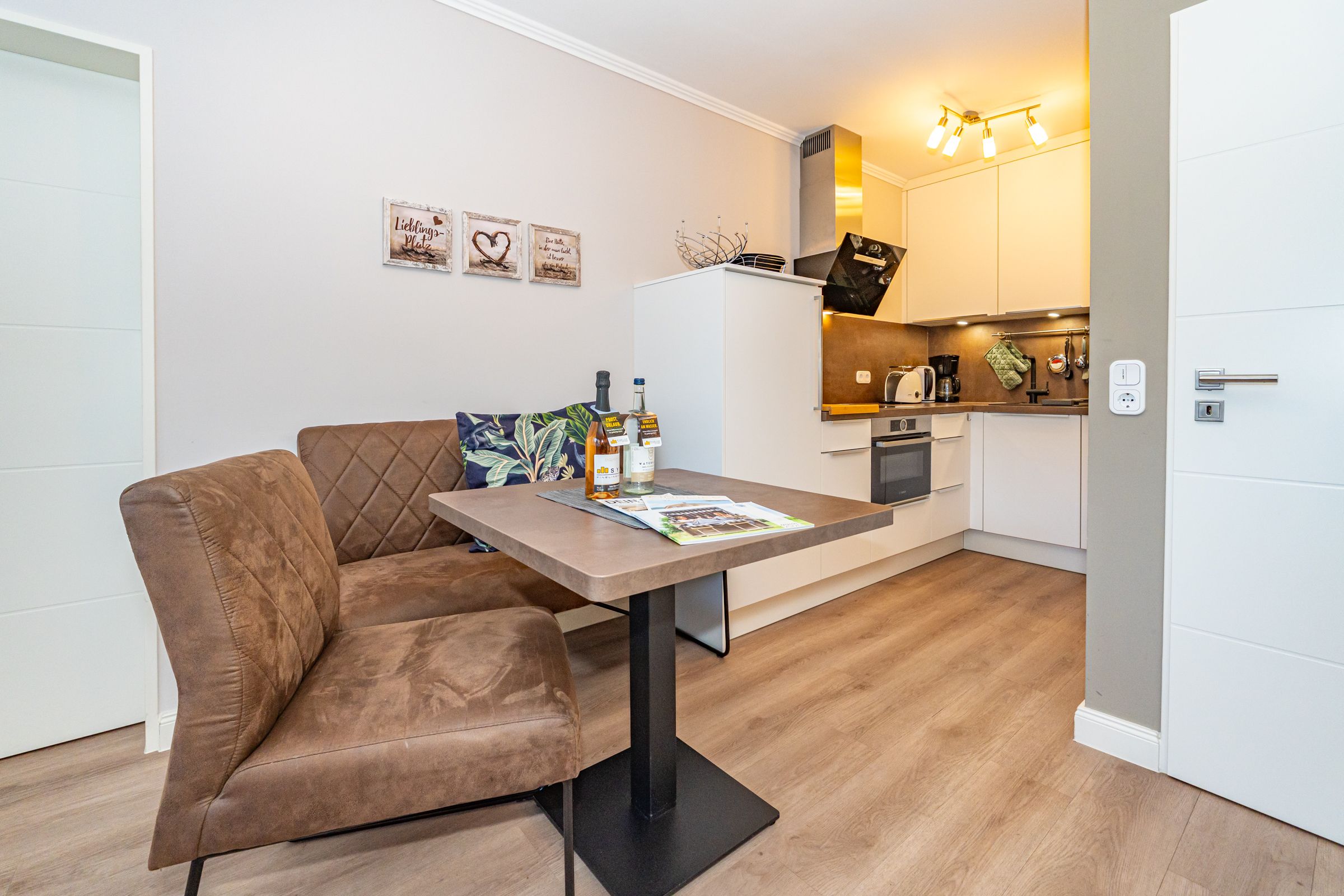 Vollständige BeschreibungDie zauberhafte Ferienwohnung Sünhair befindet sich in der Hochparterre (ebenerdig und über drei Stufen zu erreichen) eines Appartementhauses in Westerlands Innenstadt und verbindet modernen Komfort mit einer besonders attraktiven Lage. Mit insgesamt zwei Zimmern, darunter ein separates Schlafzimmer und ein geräumiger Wohnbereich, bietet das Domizil Platz für bis zu zwei Personen. Der offen zum Wohnzimmer gestaltete Küchenbereich verfügt über einen Ceranherd, Backofen, Kühlschrank mit integriertem Gefrierfach, Spülmaschine, Wasserkocher, Toaster sowie eine Kaffeemaschine und sämtliche erforderlichen Küchenutensilien. Somit ist eine umfassende Selbstversorgung mühelos möglich.