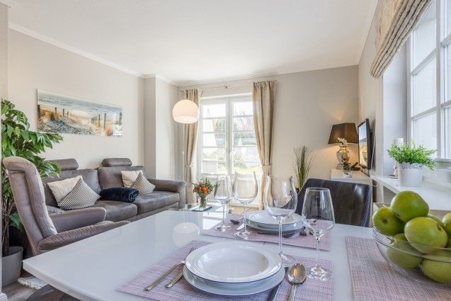 Die Wohnung verfügt über zwei Räume, darunter ein separates Schlafzimmer mit komfortablem Boxspringbett (180x 200m) und ein modern ausgestattetes Wohnzimmer mit gemütlicher Sofaecke und Sessel. Die offene Küche ist praktisch in das Wohnzimmer integriert und stellt sämtliche wichtige Küchengeräte und Utensilien bereit, darunter Herd, Backofen, Mikrowelle, Kühlschrank mit Gefrierfach, Spülmaschine, Kaffeemaschine, Toaster sowie Wasserkocher. Ein Esstisch bietet ausreichend Platz für gemeinsame Mahlzeiten.
